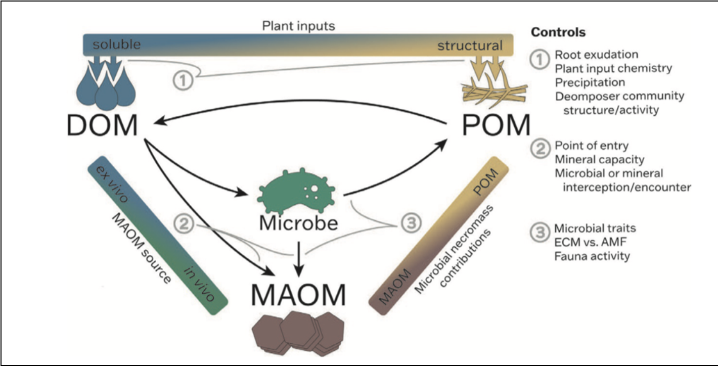 MOAM forms when microbial byproducts bind to soil minerals. This creates highly stable carbon that can remain in soil for decades or longer.